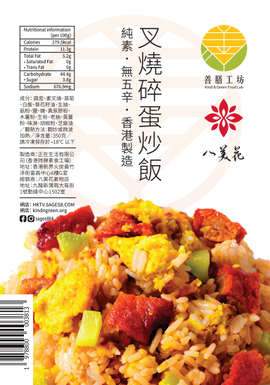 成份﹕腐皮,素叉燒,萵筍,白飯,葵花籽油,生抽,菇粉/ 香菇萃取物,原蔗糖,海鹽,麥芽糖,黃原膠粉,木薯粉,生粉,鹼水,老抽,黃薑粉,味淋,胡椒粉,芝麻油